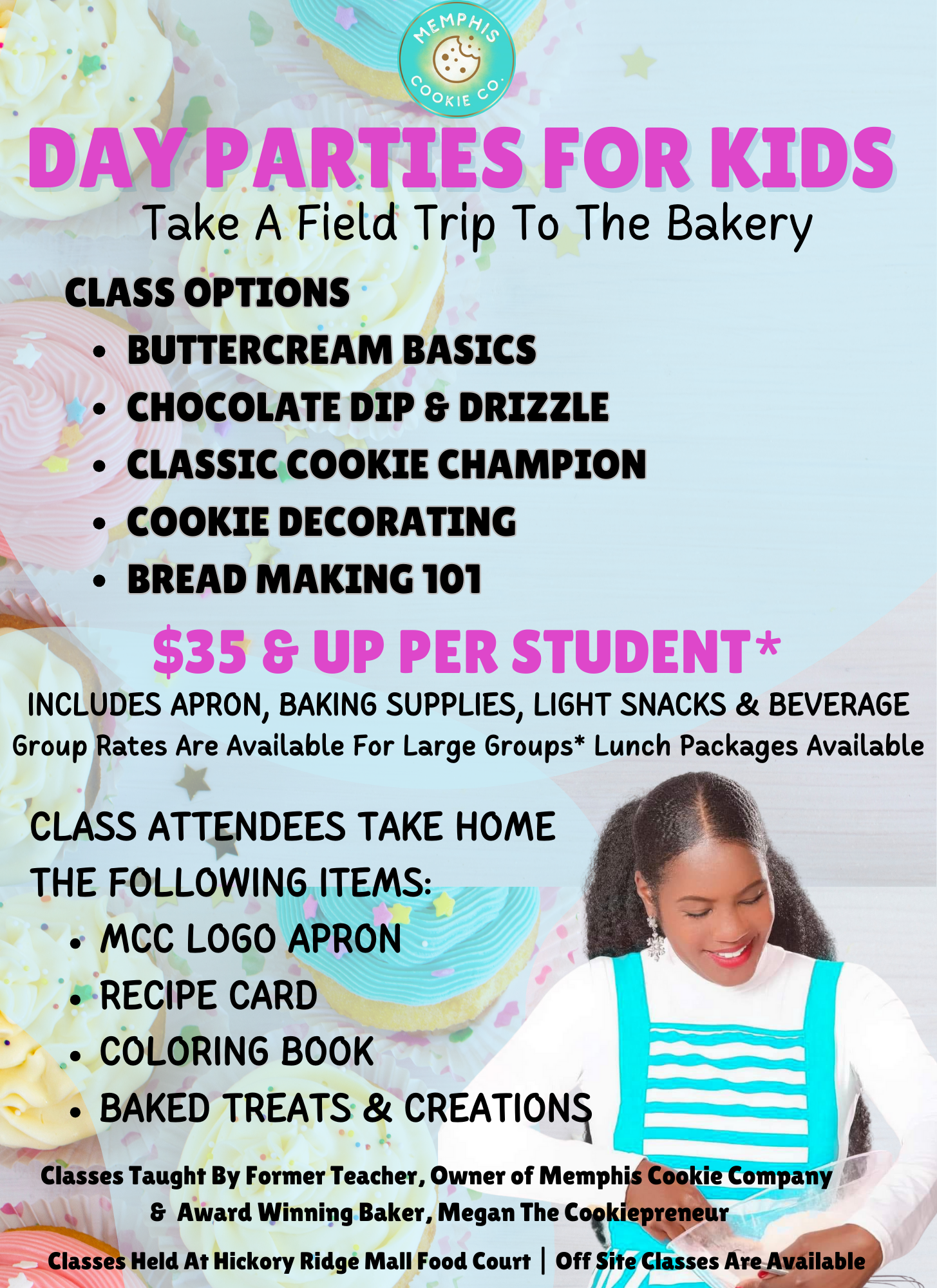 Classes are $35 PER STUDENT. The fee for each class covers all supplies and an apron for each student. Group rates are available for groups of 10 or mores. A $50.00 Non-Refundable Deposit Is Required To Book Field Trip. Deposit Is Placed Towards Final Costs. Should Trip Be Cancelled The Deposit Cannot Be Returned But It Can Be Used Towards A Future Field Trip.
